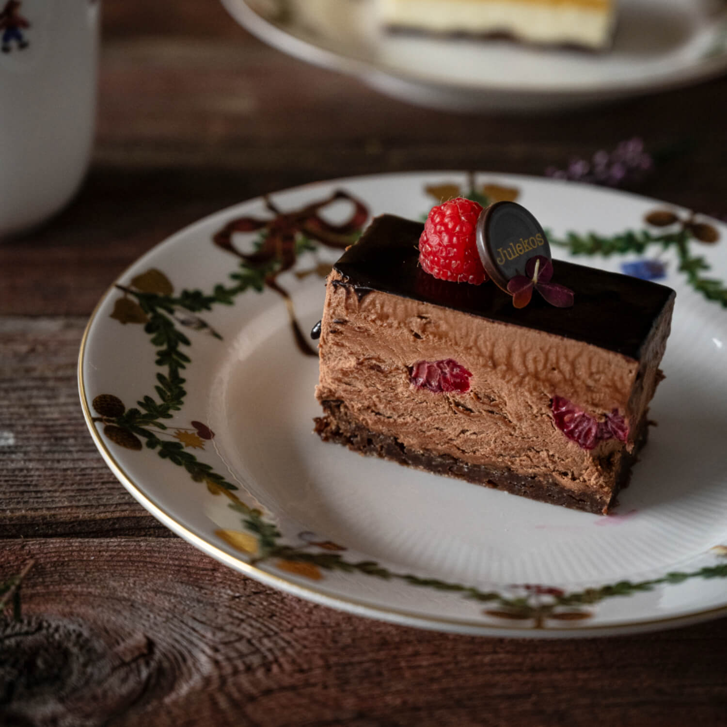 Sjokolademoussekake laget på mørk Valrhonasjokolade med en myk sjokoladebunn og bringebær i midten.