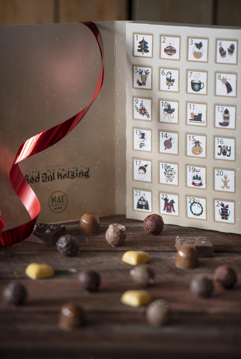 Vår egenproduserte julekalender med 24 biter med deilig sjokolade. Satt sammen av vår landslags konditor Vilde. Alle sjokoladebitene er håndlaga av oss her på MAT So Klart. Vi bruker kun de beste råvarer, som kremfløte fra Tine og sjokolade fra Valrhona.