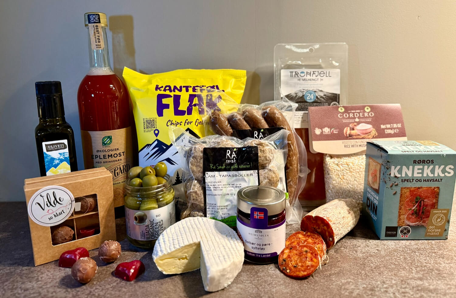 Posen inneholder spekeskinke, spekepølse, ost , oliven, 4 biter konfekt fra Vilde So Klart, marmelade/gelé, risotto, olivenolje, kjeks, tapasboller (12 stk), lammepølse, tomatsaus og en pose chips– en perfekt kombinasjon av salt, søtt og sprøtt. Innholdet kan variere litt fra gang til gang, men vi sørger alltid for at det smaker skikkelig godt.